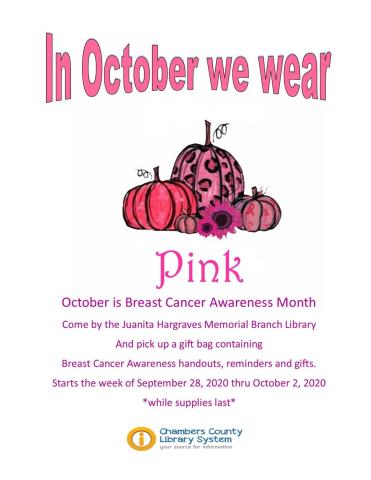 Stop by curbside pickup at the Juanita Hargraves Memorial Branch, Winnie library from September 28 to October 2 to receive a FREE gift bag with information regarding Breast Cancer Awareness and breast self-examination. FREE gift bag is subject to availability, while supplies last. Ages 18+