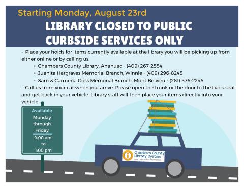 Although the library buildings are currently closed, curbside pickup is available Monday through Friday, 8:00am to 5:00pm and Saturday, 9:00am to 1:00pm.