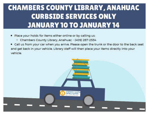 Curbside pickup services include: reserving and checking out library materials (audiobooks, books, and DVDs), as well as contactless faxing and printing. More information on curbside pickup is available here.