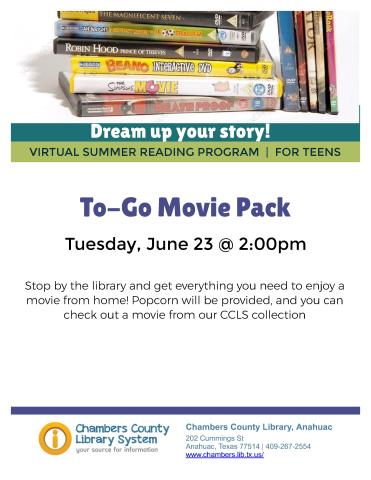 Stop by the Chambers County Library, Anahuac and get everything you need to enjoy a movie from home! Popcorn will be provided, and you can check out a movie from our CCLS collection. Movies are also available to stream using Hoopla. Available while supplies last.