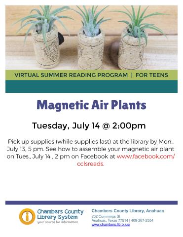 Pick up supplies at the Chambers County Library, Anahuac by Monday, July 13 at 5pm. Join us on our Facebook page on Tuesday, July 14 at 2pm to see how to assemble your magnetic air plant. Available while supplies last.
