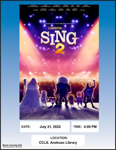 Showing at the Chambers County Library, Anahuac at 4:00pm: Sing 2 [Rated PG, 110 mins.].