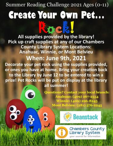 Kids (ages 0-11), pick up your kit to make your own pet rock! Bring your decorated rock back to the library by June 12 and receive a secret code! Enter the code in Beanstack by June 15 for your chance to win a gift card! The decorated rocks will be on display at the library through the summer.