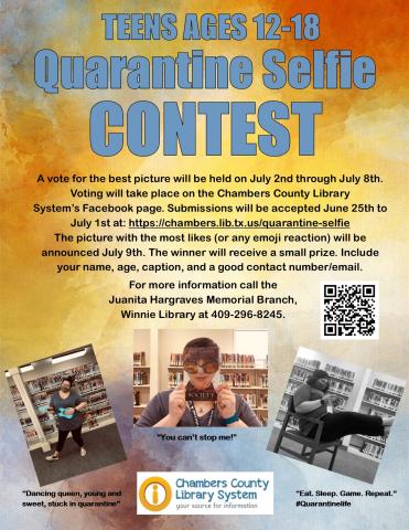 Submit entries by Wednesday, July 1 to: https://chambers.lib.tx.us/quarantine-selfie