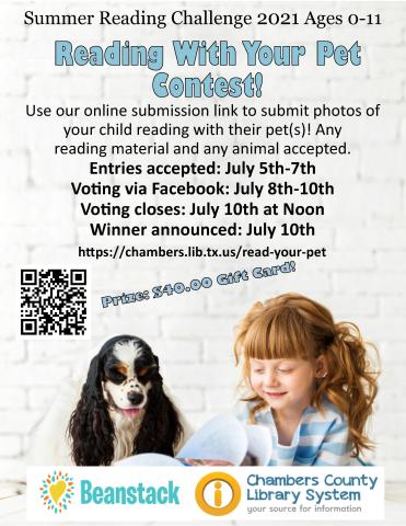 Submit a picture of your kid(s) (ages 0-11) reading with their dog, cat, horse, chicken, or any pet they have! Submit photos on the library's website from July 5 to July 7. Photos will be posted on Facebook for voting July 8 to July 10 at noon. 1 like/emoji = 1 vote. The photo with the most votes wins!