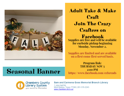 Supply pick up begins Monday, November 2 at the Sam & Carmena Goss Memorial Branch Library, Mont Belvieu. Supplies are FREE & are subject to availability, while supplies last.